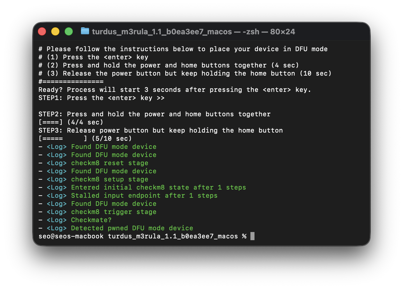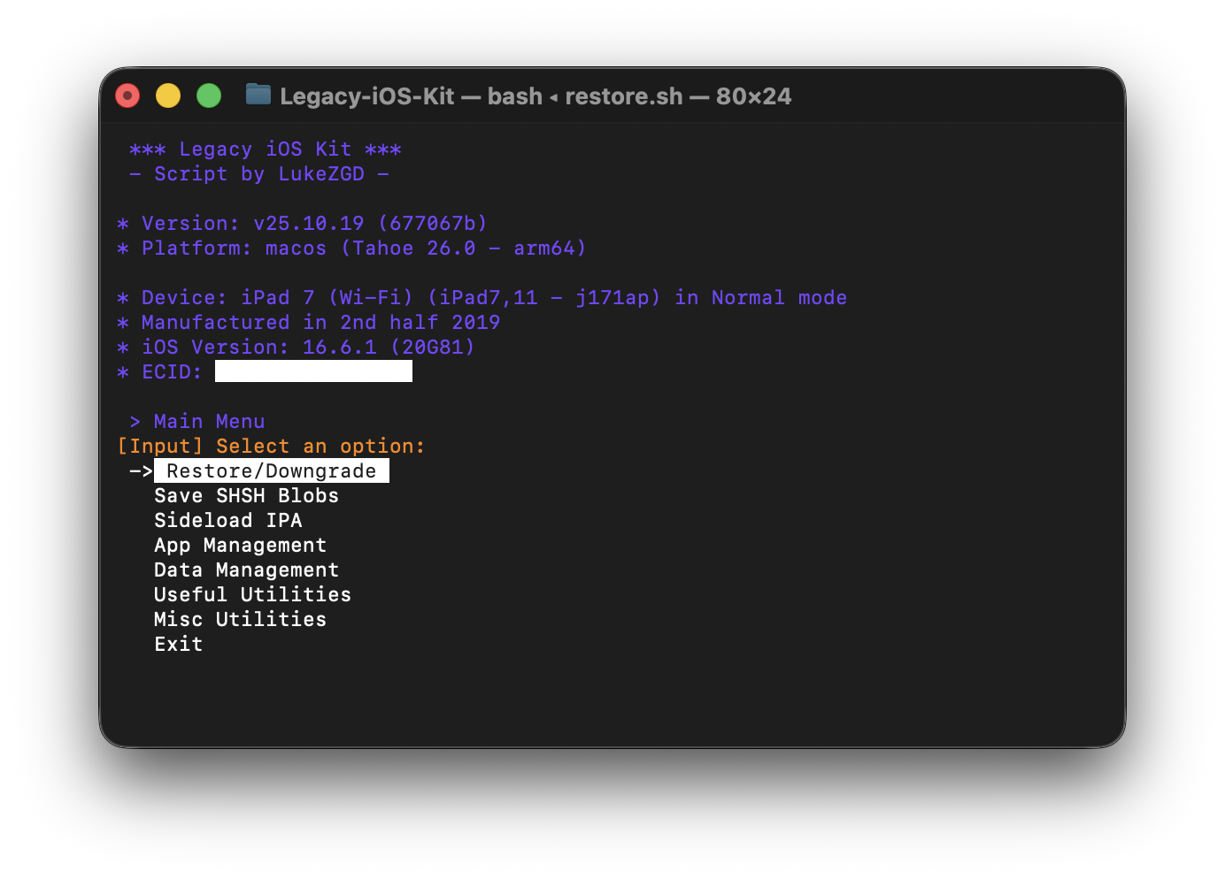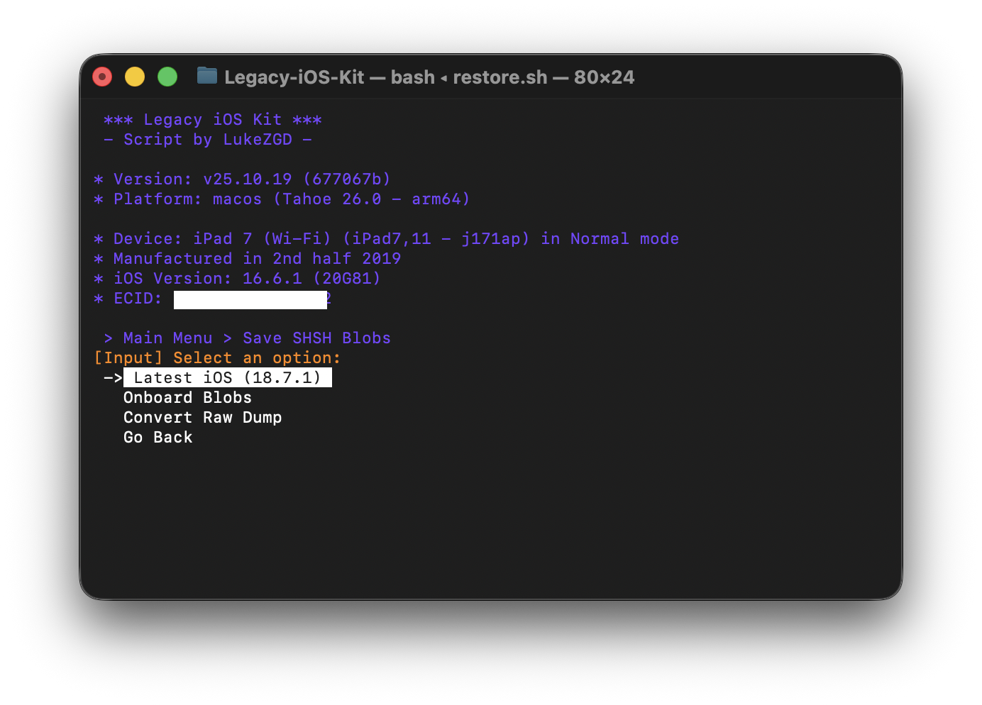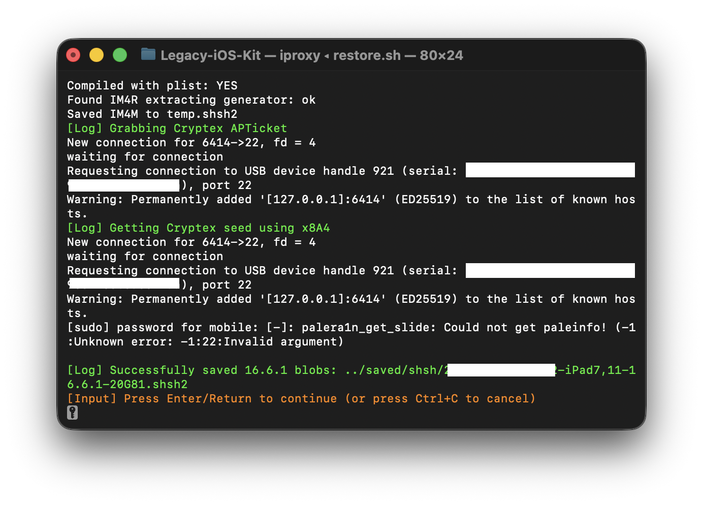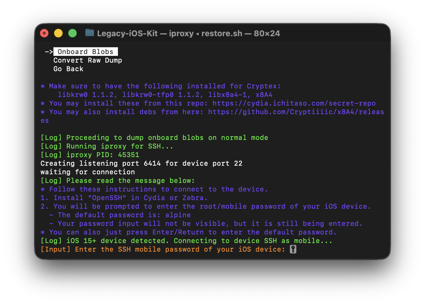 - Legacy-iOS-Kit 프로젝트를 git clone해서 가져온고 onboard로부터 shsh2 blobs를 저장한다. https://github.com/LukeZGD/Legacy-iOS-Kit