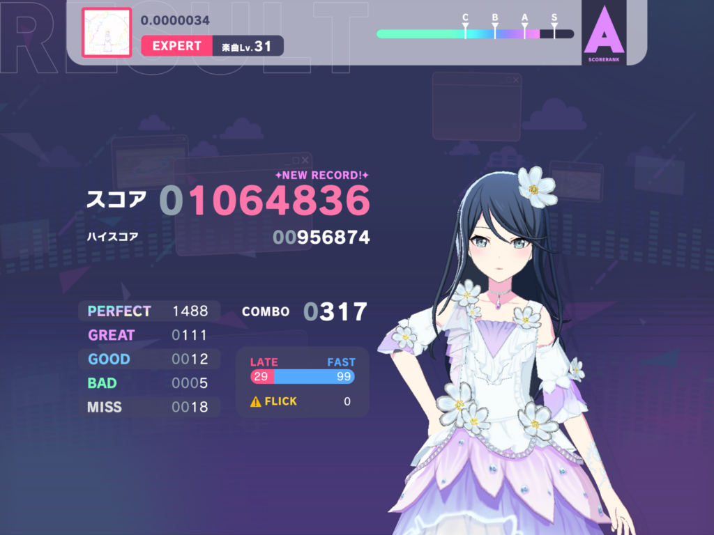 그리고 0.0000034 익스퍼트, 즉 31레벨 악곡을 처음으로 클리어하였다.